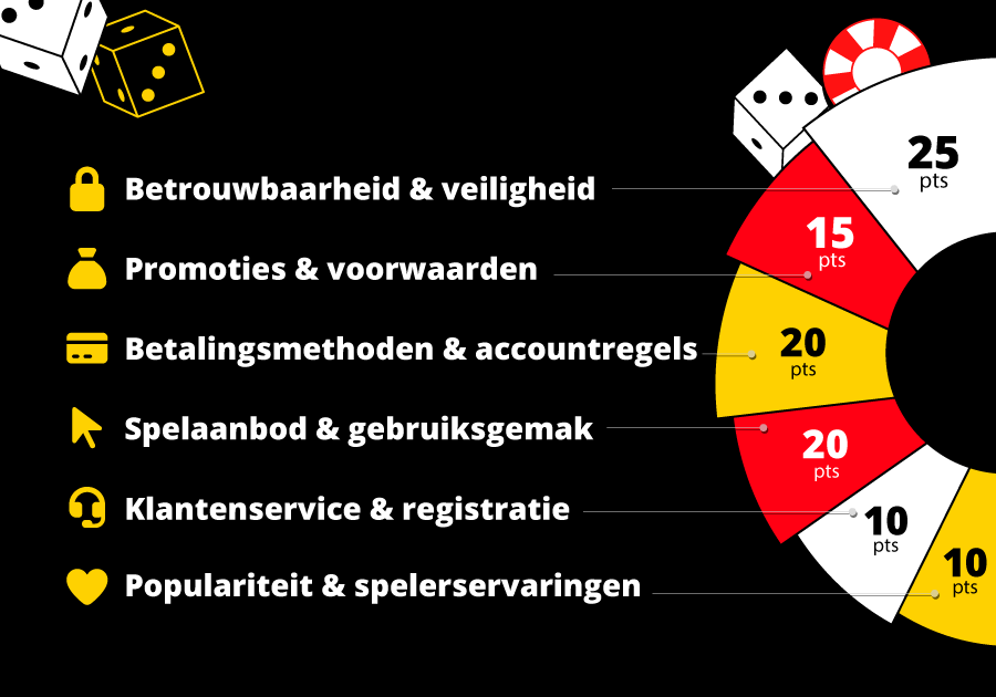 Deze onderdelen, met elk een eigen puntenweging, weerspiegelen de belangrijkste aspecten bij het kiezen van een online kansspelaanbieder. Zo verzekeren we dat elk aanbevolen casino wordt getest via dezelfde strenge criteria en voldoet aan onze hoge eisen.